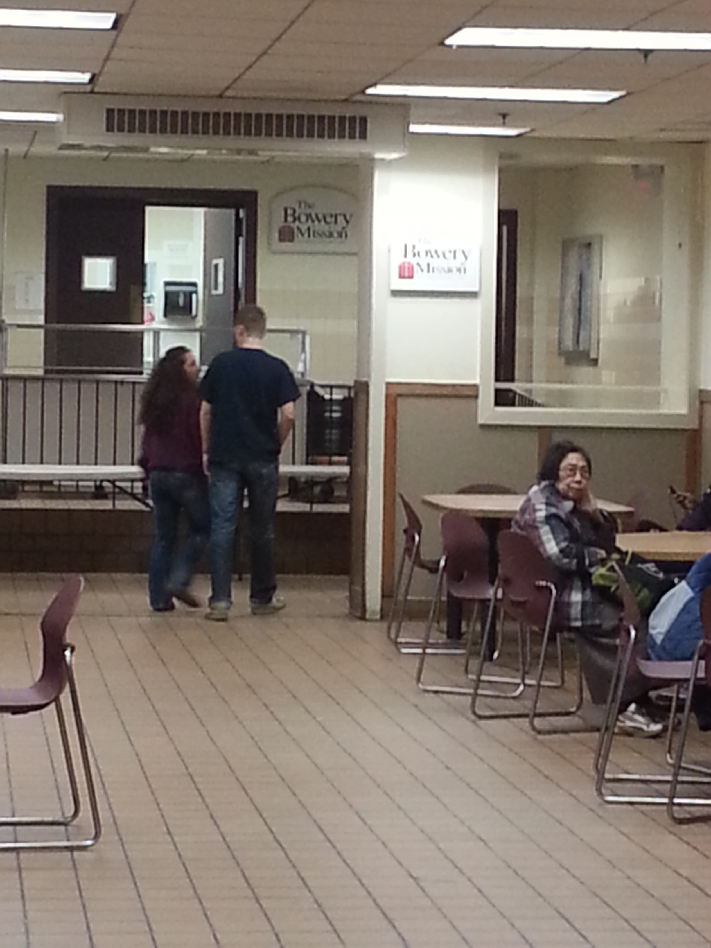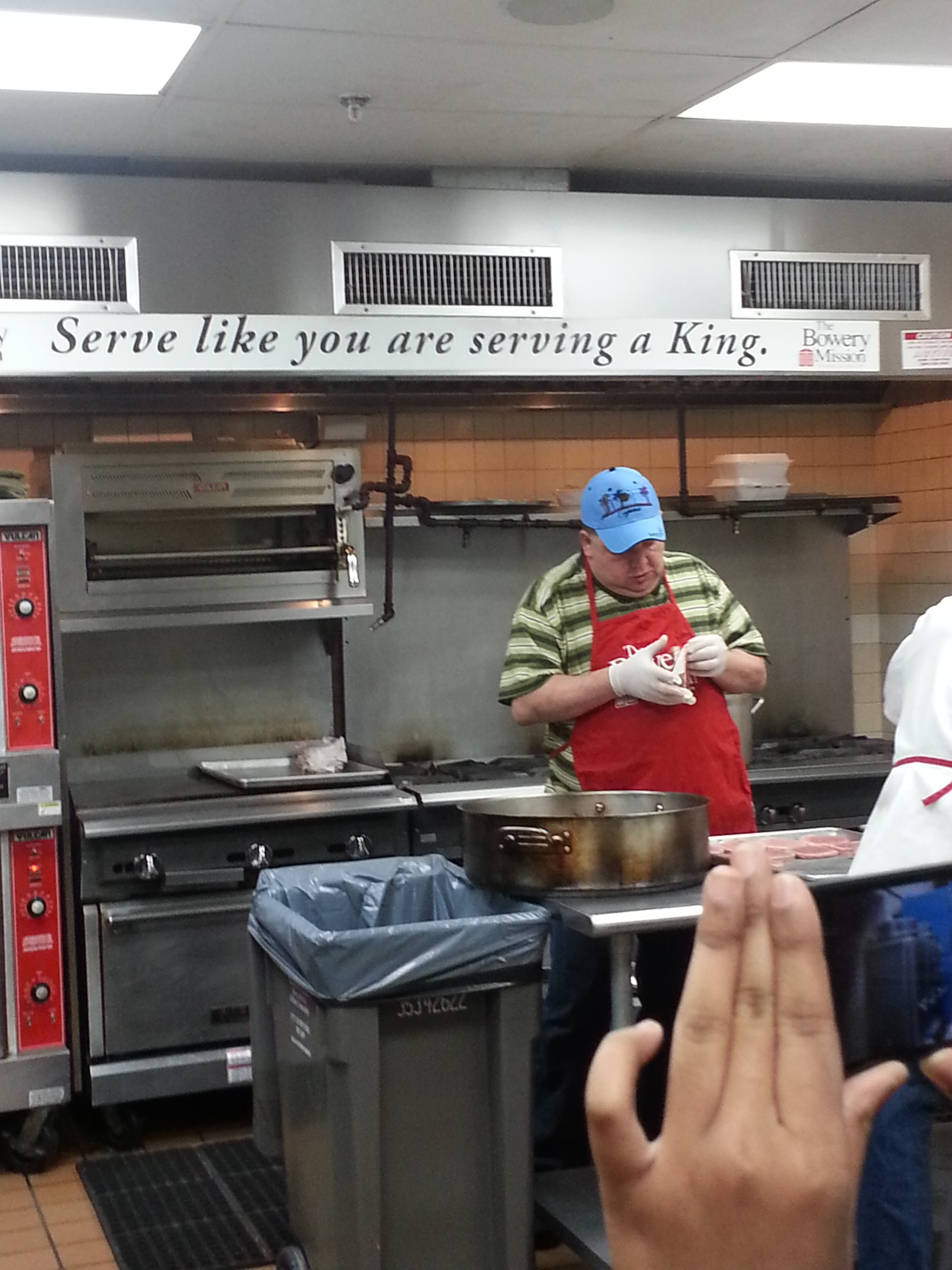 The diversity amongst the cooks at the Bowery Mission which also describes the population of people they service. The quote in the background, “Serve like you are serving a King,” speaks to how the Bowery Mission treats all of the people they service despite their socioeconomic standing.