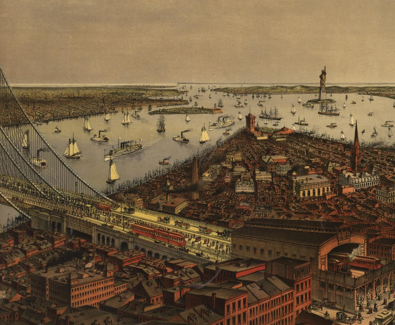 Brooklyn, as depicted in the 1885 Currier and Ives print "Grand birds eye view of the Great East River Suspension Bridge." Image is in the public domain. Courtesy: Library of Congress.